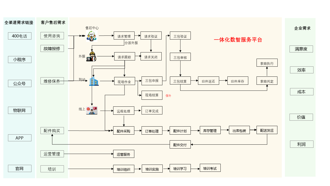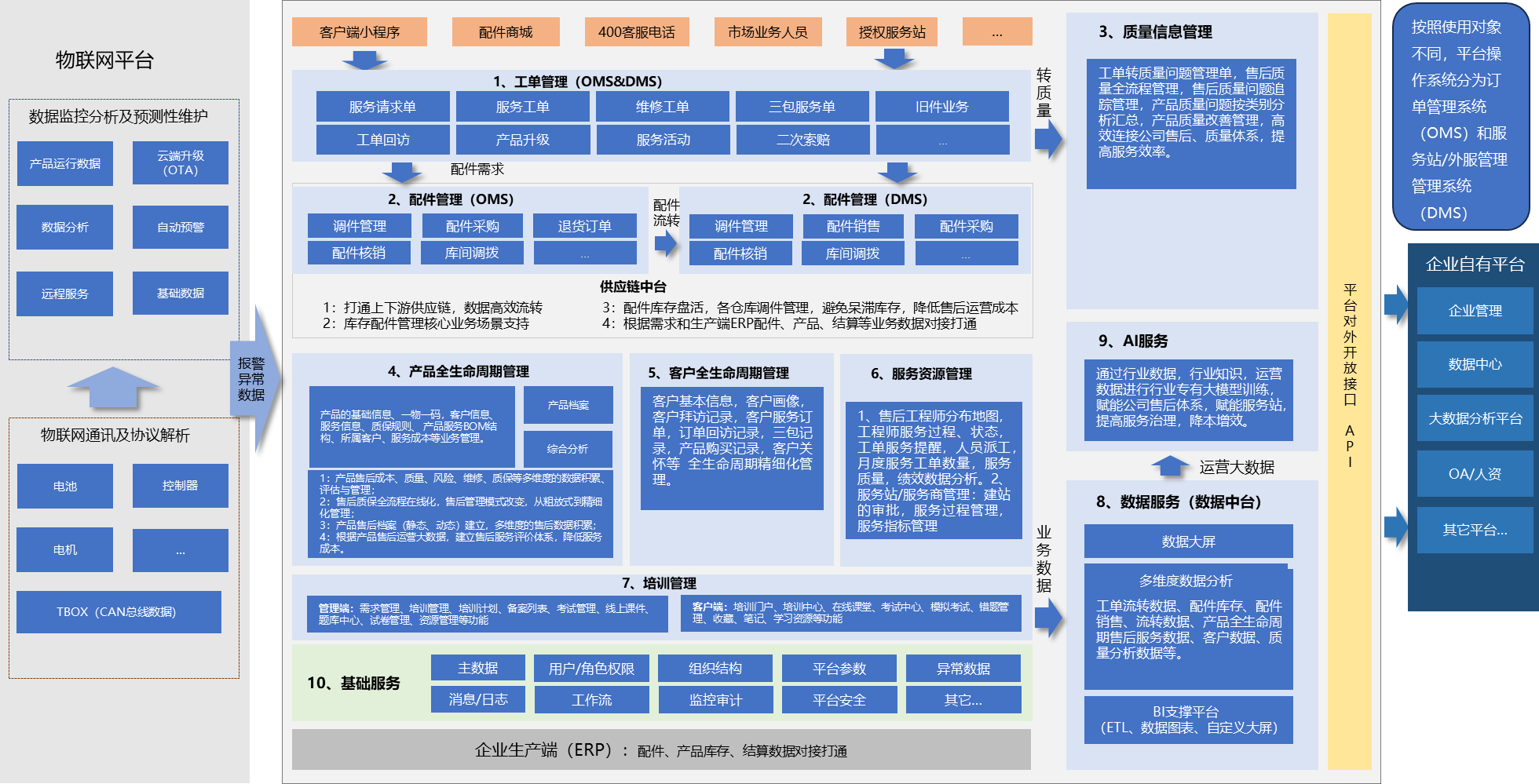 业务功能上不局限于售后工单、配件管理等业务,而是建立公司级的一体化服务体系,打通售后、销售、服务站、质量、客户等各个业务流程,客户角色多元化,形成全业务场景、全流程在线管理的闭环能力,持续满足客户需求,为客户创造终身价值,同时,提高公司可持续的、综合的治理能力; 技术上采用云计算、大数据等数字化技术,推动数据驱动业务能力的提升,同时,融合AI大模型的能力,逐步实现智能化、建立私有大模型。
